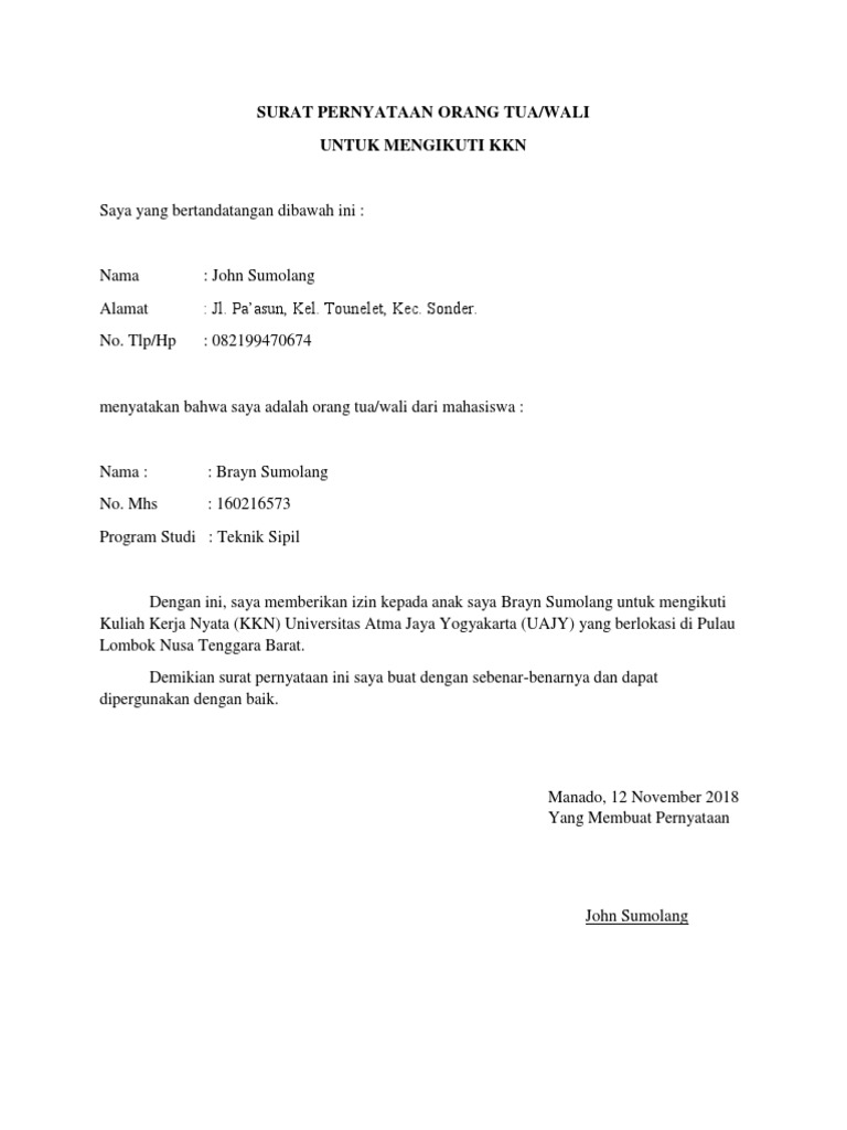 Surat pernyataan merupakan surat yang dibuat untuk menyatakan sesuatu kepada orang lain atau instansi secara resmi atau formal. 5.15 contoh surat pernyataan orang tua. Hal ini karena mengingat bahwa orang yang awam sekalipun mayoritas pernah membuatnya untuk keperluan tertentu. Adapun mengenai pengertian dari surat pernyataan adalah sebuah surat yang dibuat oleh seseorang dimana di dalam surat tersebut berisi sebuah pernyataan yang. Home » contoh surat » surat pernyataan » contoh surat pernyataan orang tua untuk bekerja. Adapun contoh surat izin masih terbagi ke dalam jika diartikan secara sederhana, maka surat izin orang tua merupakan surat yang digunakan untuk menyatakan pernyataan orang tua terkait. Identitas diri identitas diri terdapat dua bagian. Contoh surat izin / contoh surat persetujuan orang tua untuk mendaftar tni. Maka dari itu, di bawah ini beberapa contoh yang bisa anda pergunakan sebagai bahan referensi. Mengingat pentingnya keberadaan surat maka sudah seharusnya anda untuk mempelajari berbagai jenis surat izin orang tua. Semua contoh ini ada karena kebutuhan akan surat ini memang besar. Surat pernyataan orang tua xxvi. Namun surat ini hanya digunakan/dibutuhkan jika orang tua pelajar/mahasiswa tersebut tidak memiliki slip gaji.
